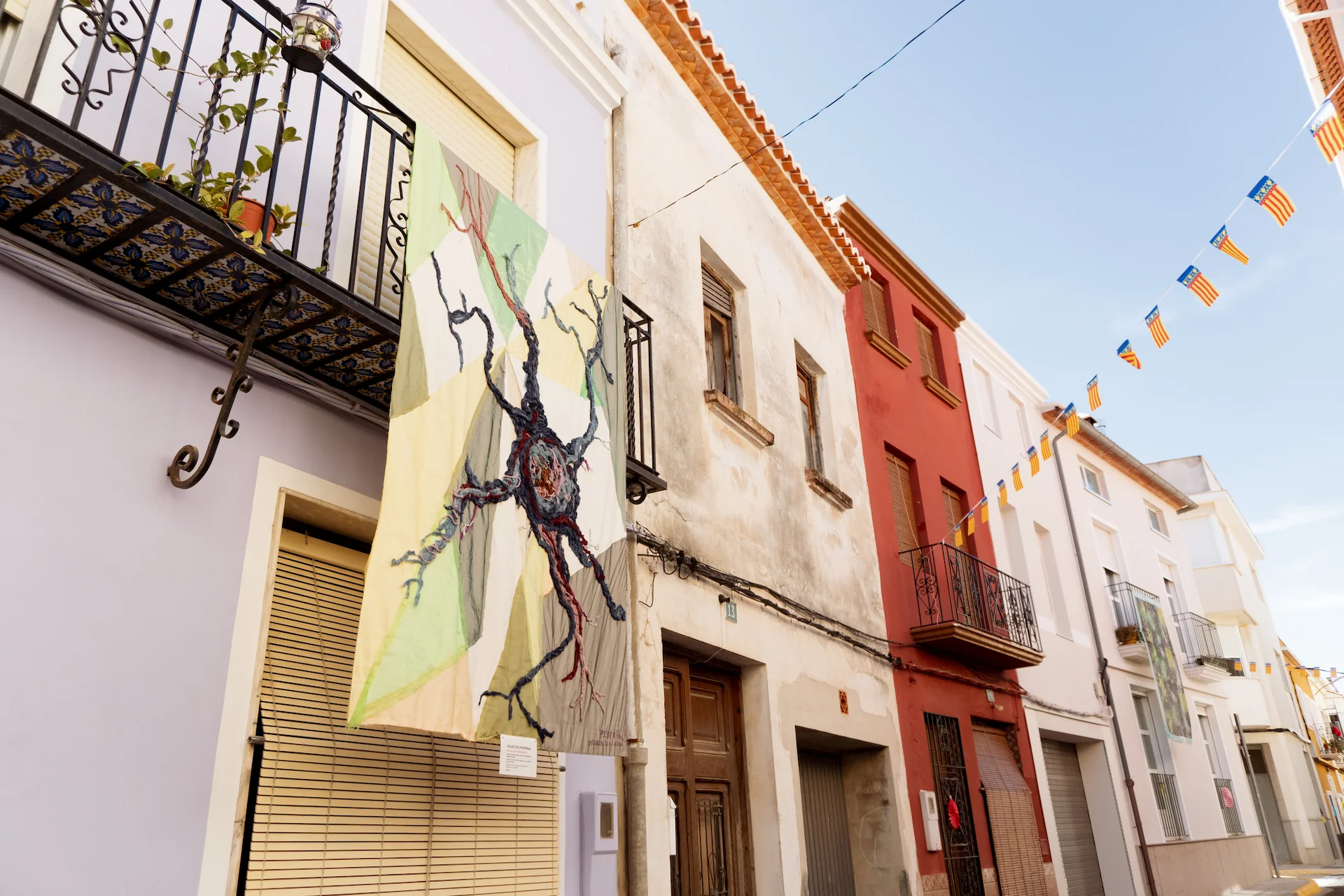 🖼️ Les balconades del carrer 9 d’Octubre lluïen l’exposició “Art al Vent”, cedida temporalment per l’Ajuntament de Gata de Gorgos. Una mostra d’art tèxtil que va transformar els balcons en una galeria a l’aire lliure.