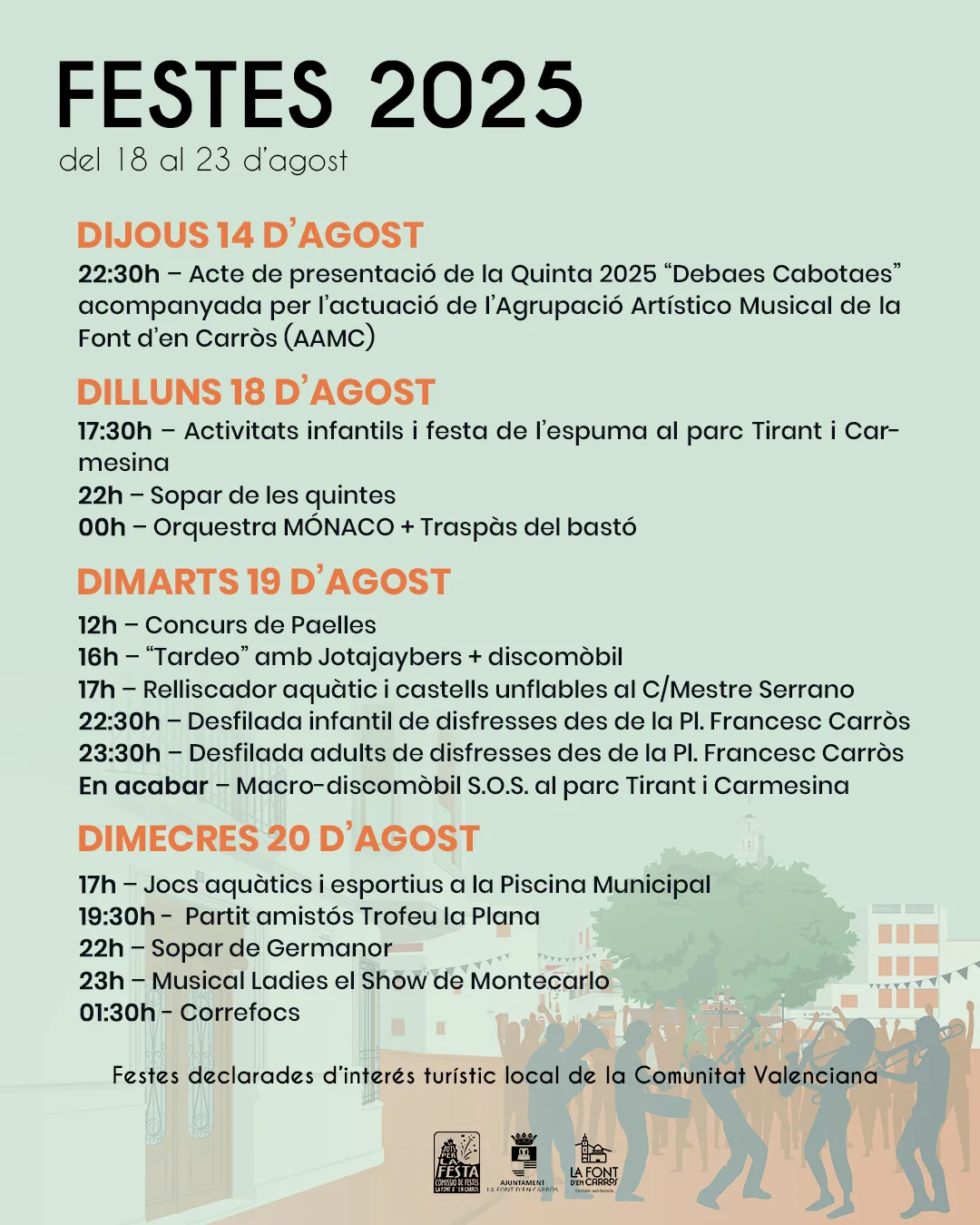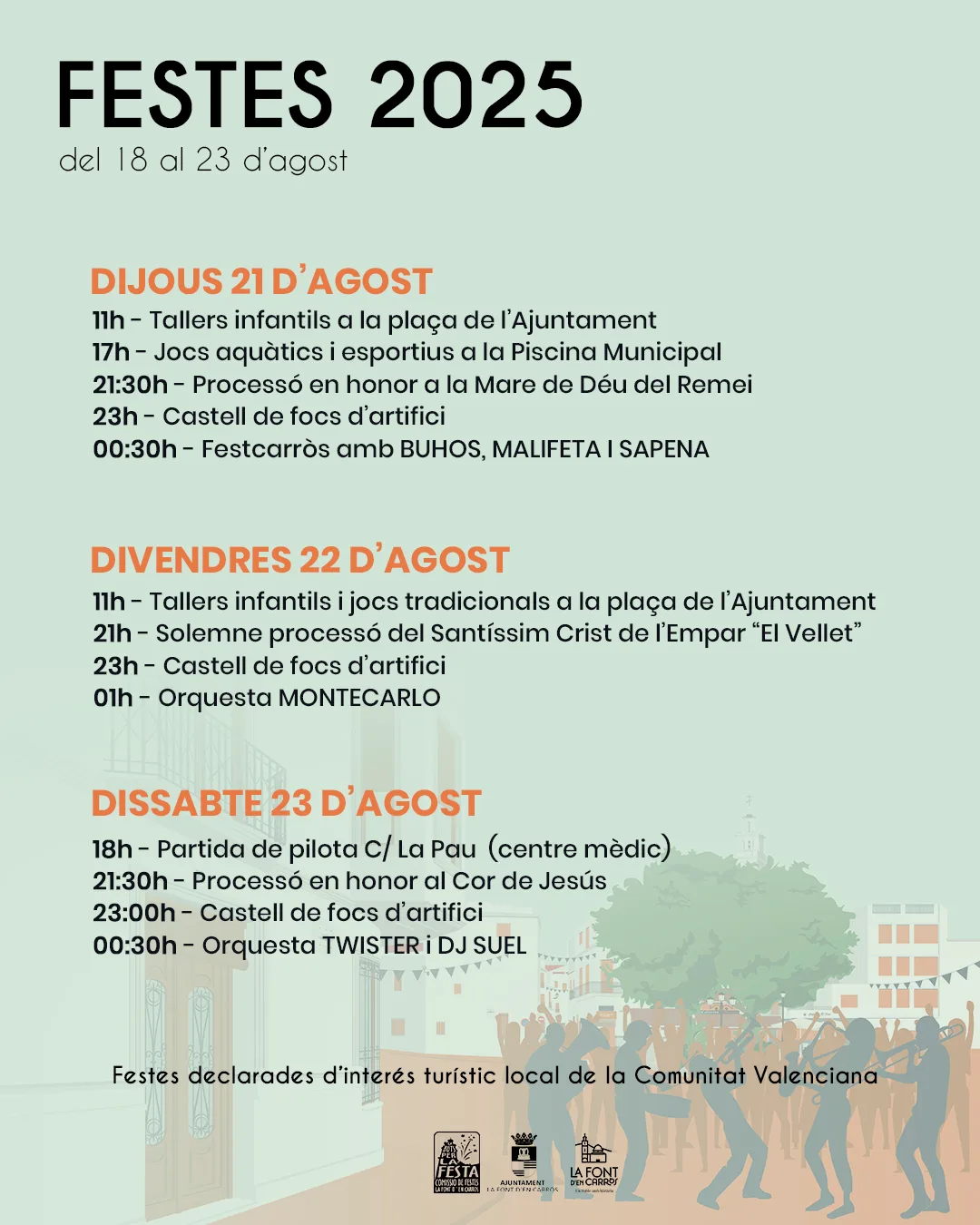 L’Ajuntament de la Font d’en Carròs vos presenta el cartell resum amb les activitats principals de les festes patronals.